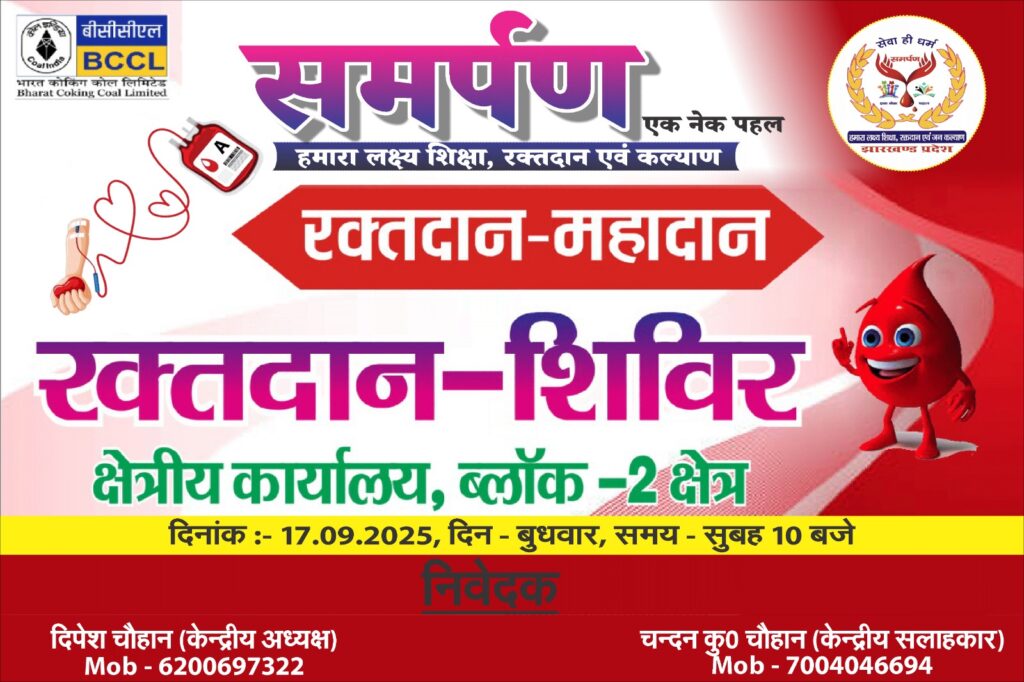 *🇮🇳रक्तदान महादान ll रक्तदान जीवनदान ll 🇮🇳* 🔔 विशेष अवसर – विशेष संकल्प 🔔 17 सितम्बर 2025 को ➡️ भारत कोकिंग कोल लिमिटेड (B.C.C.L.) द्वारा क्षेत्रीय कार्यालय, ब्लॉक – 2 क्षेत्र में रक्तदान शिविर आयोजित किया जा रहा है। यह दिन और भी पावन है क्योंकि ✨ देश के यशस्वी प्रधानमंत्री श्री नरेंद्र दामोदरदास मोदी …